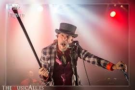 La puesta en escena es similar a las que le hemos visto tretar últimamente, todo trajeado, con su sombrero de copa y gafas de sol, aunque esta vez sin el estilo steampunk. Lo que sí que sigue usando son sus dos cachavas, pero no para andar por el escenario, sino para hacer remolinos con ellas.
